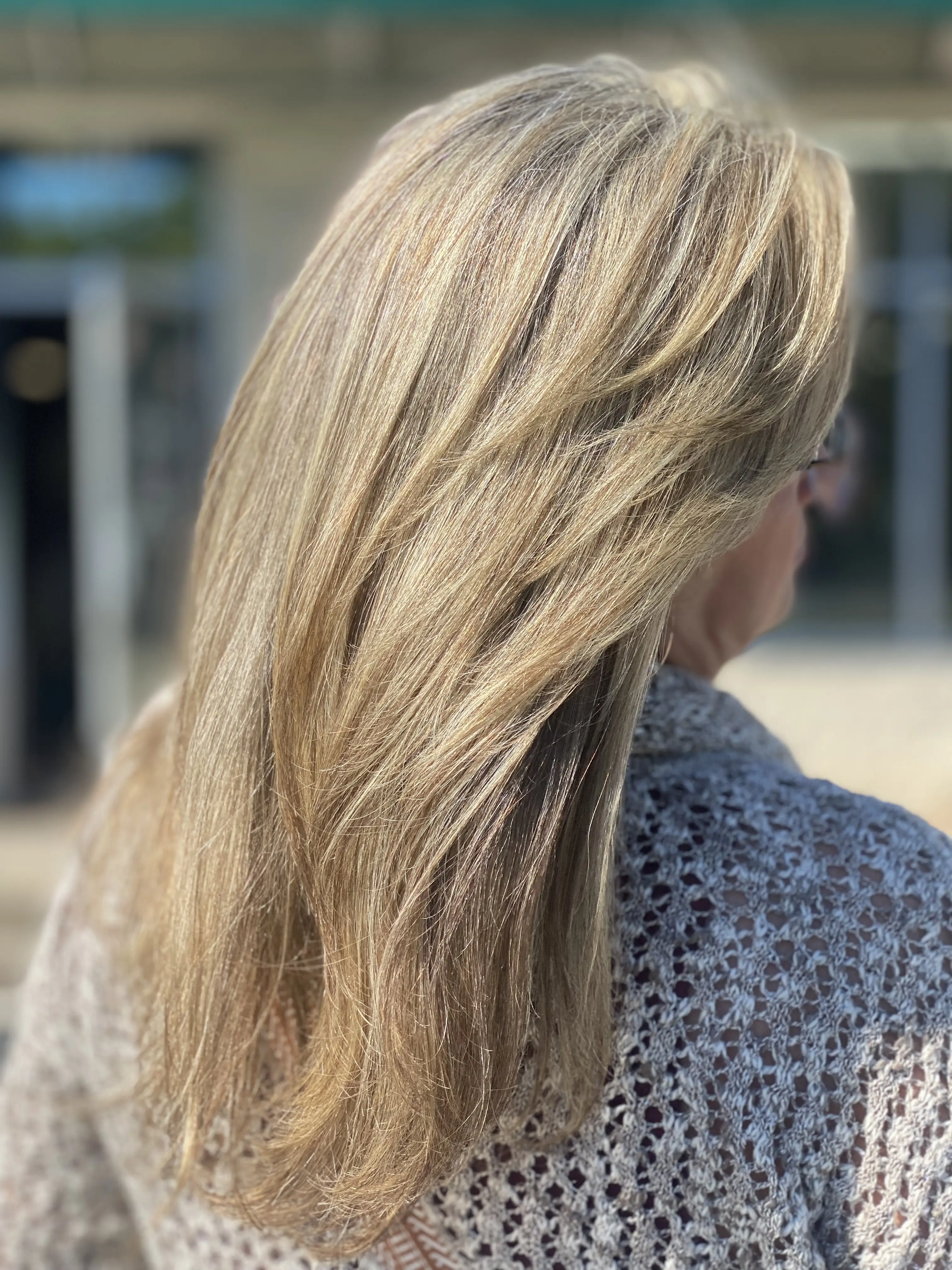 The Deluxe Partial Highlight provides more coverage than a traditional partial highlight. I’ll strategically customize placement and tone to enhance your face frame and movement while maintaining the health of your hair. Perfect for those who want noticeable brightness without committing to a full-head color—let’s discuss the best shades and maintenance plan to achieve your desired outcome. (covers foil application time of 1 hour, extra charge for toner if needed)